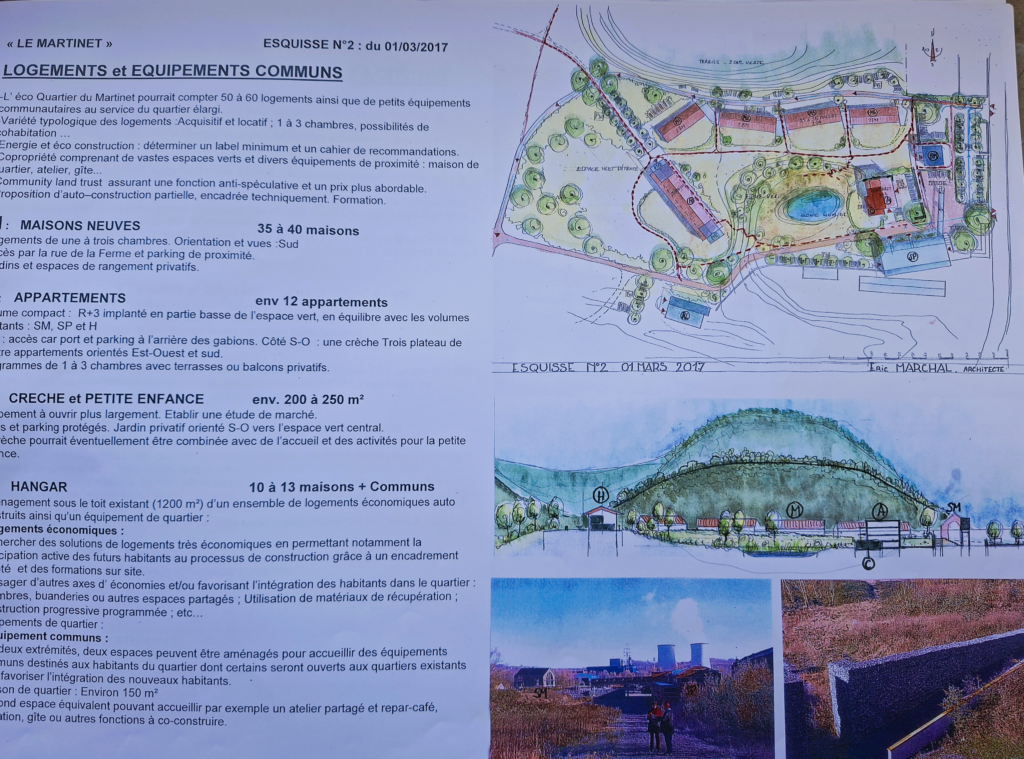 Après maintes visites au Martinet et discussions avec le Comité de Défense, nos deux professionnels établirent une esquisse de l’écoquartier et du projet de crèche, en soi une épure suffisamment documentée et chiffrée pour convaincre un investisseur potentiel !